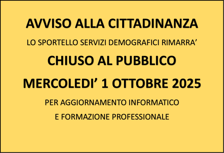 Si informa la Cittadinanza che il giorno MERCOLEDI' 1 OTTOBRE 2025 lo sportello servizi demografici rimarrà CHIUSO al pubblico per aggiornamento dei sistemi informatici e formazione professionale.