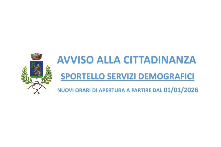 A partire da gennaio 2026, lo sportello "Servizi Demografici" sarà aperto al pubblico nei seguenti giorni e orari: